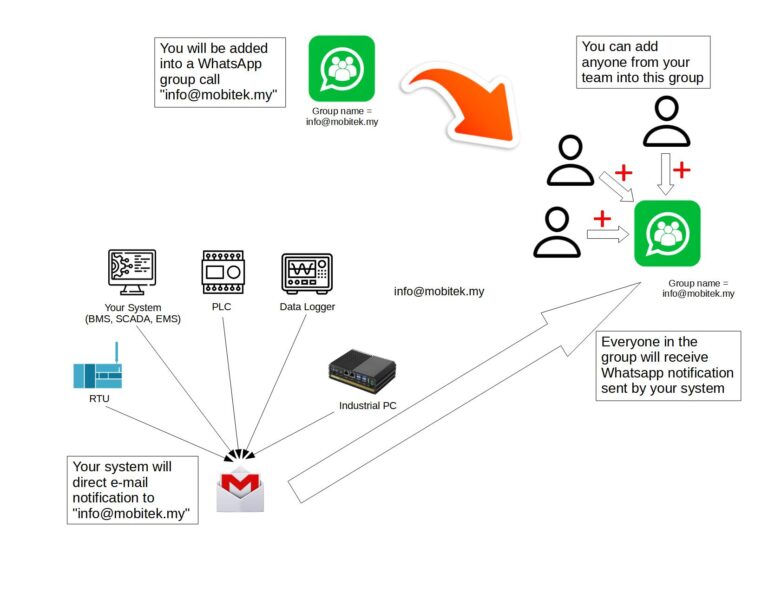 allows any monitoring system to send out alert via WhatsApp to 1 group or more.