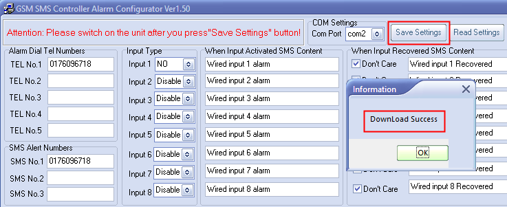 12. Make changes then “Save Settings”. If save is successful, then it will show “Download Success”. For more information about the settings, please refer to page 9 of the user manual, “SMS Controller S130~S150 user manual v. 3.0.pdf”.