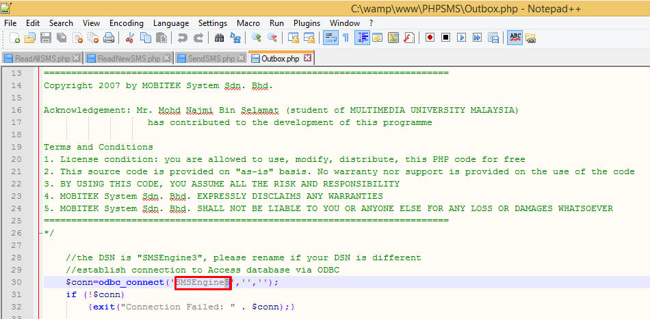 - Open and edit the Outbox.php, ReadAllSMS.php, ReadNewSMS.php and SendSMS.php.