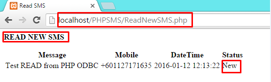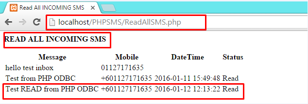 <html> <head> <title>Read SMS</title> </head> <body bgcolor="white" text="black" link="blue" vlink="purple" alink="red"> <p><b> READ NEW SMS </b></p> <?php /* ========================================================================== Copyright 2007 by MOBITEK System Sdn. Bhd. Acknowledgement: Mr. Mohd Najmi Bin Selamat (student of MULTIMEDIA UNIVERSITY MALAYSIA) has contributed to the development of this programme Terms and Conditions 1. License condition: you are allowed to use, modify, distribute, this PHP code for free 2. This source code is provided on "as-is" basis. No warranty nor support is provided on the use of the code 3. BY USING THIS CODE, YOU ASSUME ALL THE RISK AND RESPONSIBILITY 4. MOBITEK System Sdn. Bhd. EXPRESSLY DISCLAIMS ANY WARRANTIES 5. MOBITEK System Sdn. Bhd. SHALL NOT BE LIABLE TO YOU OR ANYONE ELSE FOR ANY LOSS OR DAMAGES WHATSOEVER ========================================================================== */ //the DSN is "SMSEngine5", please rename if your DSN is different //establish connection to Access database via ODBC $conn=odbc_connect('smsengine5','',''); if (!$conn) {exit("Connection Failed:" . odbc_errormsg() );} //read new incoming SMS $sql="SELECT Message, Mobile, DateTime, Status FROM Inbox WHERE STATUS = 'New'"; $rs=odbc_exec($conn,$sql); if (!$rs) {exit("Error in SQL");} //---------- display in table ----------------- echo "<table><tr>"; echo "<th>Message</th>"; echo "<th>Mobile</th>"; echo "<th>DateTime</th>"; echo "<th>Status</th></tr>"; while (odbc_fetch_row($rs)) { $message=odbc_result($rs,"Message"); $mobile=odbc_result($rs,"Mobile"); $datetime=odbc_result($rs,"DateTime"); $status=odbc_result($rs,"Status"); echo "<tr><td>$message</td>"; echo "<td>$mobile</td>"; echo "<td>$datetime</td>"; echo "<td>$status</td></tr>"; } echo "</table>"; //---------- display in table ----------------- //change status from "New" to "Read" $sql = "UPDATE Inbox SET Status ='Read' WHERE Status = 'New' "; $rs2=odbc_exec($conn,$sql); if (!$rs2) {exit("Error in SQL");} //close connection to database odbc_close($conn); ?> </body> </html>