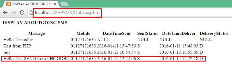 <html> <head> <title>DISPLAY All OUTGOING SMS</title> </head> <body bgcolor="white" text="black" link="blue" vlink="purple" alink="red"> <p><b>DISPLAY All OUTGOING SMS</b></p> <?php /* ========================================================================== Copyright 2007 by MOBITEK System Sdn. Bhd. Acknowledgement: Mr. Mohd Najmi Bin Selamat (student of MULTIMEDIA UNIVERSITY MALAYSIA) has contributed to the development of this programme Terms and Conditions 1. License condition: you are allowed to use, modify, distribute, this PHP code for free 2. This source code is provided on "as-is" basis. No warranty nor support is provided on the use of the code 3. BY USING THIS CODE, YOU ASSUME ALL THE RISK AND RESPONSIBILITY 4. MOBITEK System Sdn. Bhd. EXPRESSLY DISCLAIMS ANY WARRANTIES 5. MOBITEK System Sdn. Bhd. SHALL NOT BE LIABLE TO YOU OR ANYONE ELSE FOR ANY LOSS OR DAMAGES WHATSOEVER ========================================================================== */ //the DSN is "SMSEngine5", please rename if your DSN is different //establish connection to Access database via ODBC $conn=odbc_connect('SMSEngine5','',''); if (!$conn) {exit("Connection Failed:" . odbc_errormsg() );} //read all incoming SMS and display in a table $sql="SELECT Message, Mobile, DateTimeSent, SentStatus, DateTimeDeliver, DeliveryStatus FROM Outbox ORDER BY DateTimeSent"; $rs=odbc_exec($conn,$sql); if (!$rs) {exit("Error in SQL");} //---------- display in table ----------------- odbc_result_all($rs); //close connection to database odbc_close($conn); ?> </body> </html>