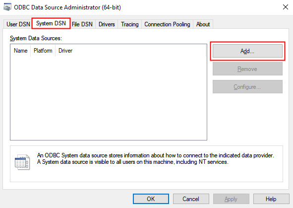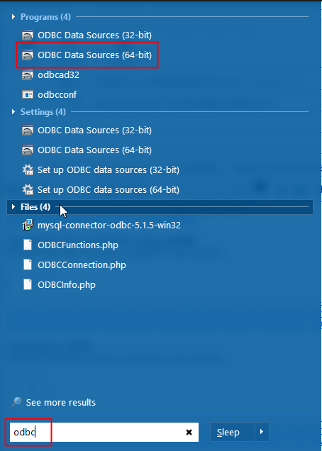 - Click Start, search for “odbc” and click on ODBC Data Sources (64-bit).