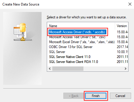 - Find the Microsoft Access Driver(*.mdb, *.accdb) then click Finish button.