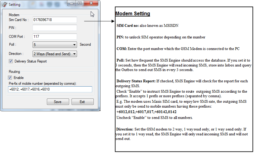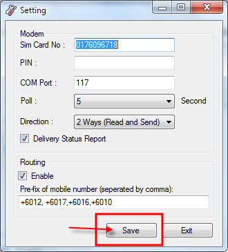 Routing: able to configure multiple mobile number prefixes (by comma separated). For example, if the GSM modem uses Maxis SIM card, in order to enjoy low SMS rate, outgoing SMS can be routed to these mobile numbers with prefixes “+6012,012,+6017,017,+60142,0142”