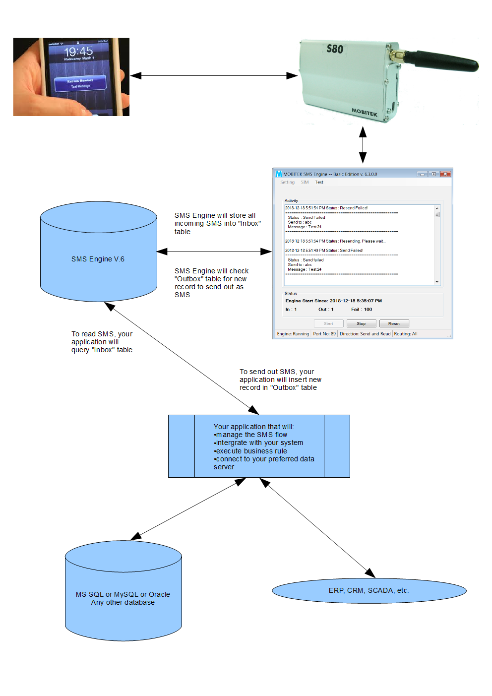 SMS Engine is a Windows application that sends and receives SMS. System integrator and software developer (SI/SD) do not need to write any code to build a SMS Gateway. The SMS Engine uses MS Access database – “SMSEngineVBNET.mdb” to store incoming SMS, and to check if there is any pending SMS to be send out. SI/SD only needs to insert record into database to send out SMS, and retrieve record from database to read SMS. The SMS Engine has taken care all SMS transactions.