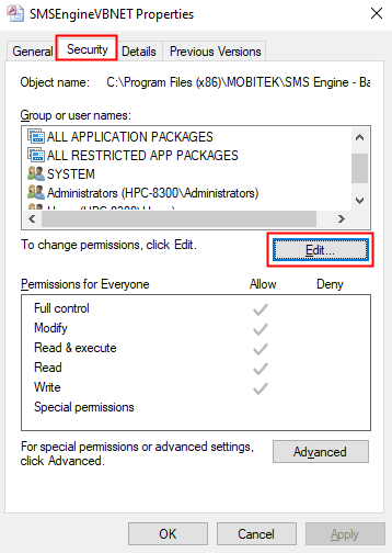 - Go to “SMSEngineVBNET.mdb” properties. In “Security” tab, click “Edit”