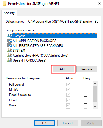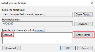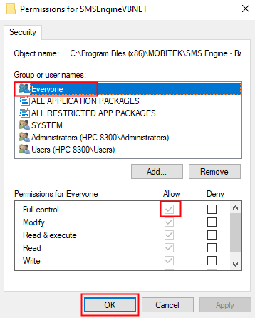 - Select “Everyone” in the “Group or user names” list and assign “Full control” to it