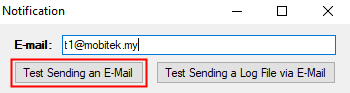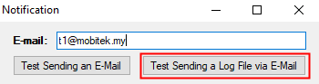 To test sending a log file, click “Test Sending a Log File via E-Mail” button. For this to work, please make sure there is a log file with current date in “..\MOBITEK\SMS Engine — Basic Edition\Log” folder. An e-mail with the log details will be sent to recipient e-mail that has been set earlier. | ![]() |
