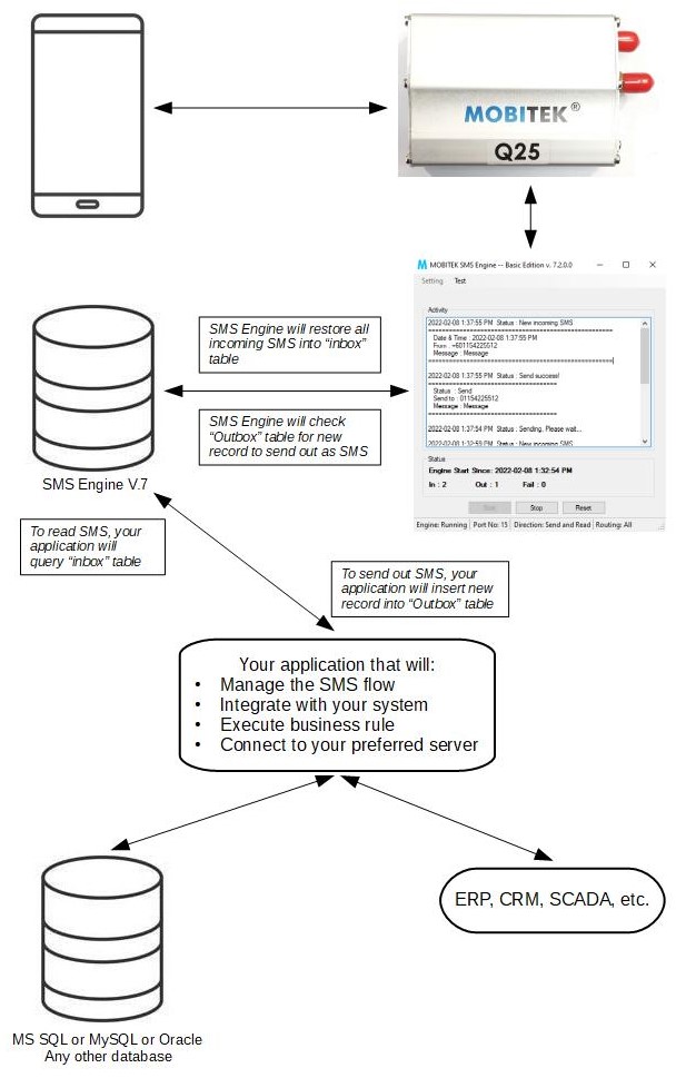 MOBITEK® SMS Engine is a Windows application that sends and receives SMS or text message. The MOBITEK® SMS Engine has taken care all SMS process and software developer do not need to write any code to build a SMS Gateway. The MOBITEK® SMS Engine uses MS Access database to store incoming SMS, and to check if there is any pending SMS to be send out. To send out SMS, insert a record into database via SQL. To read SMS, retrieve record from database via SQL.