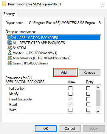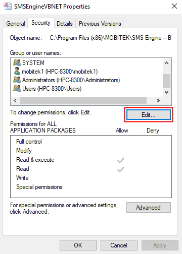 - Go to “SMSEngineVBNET.mdb” properties. In “Security” tab, click “Edit”.