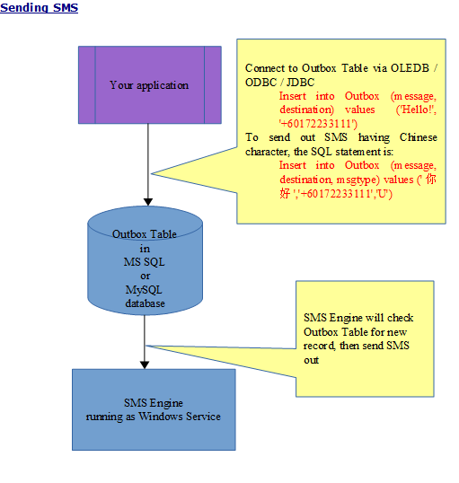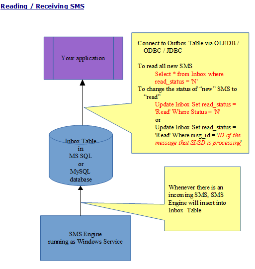SI/SD only needs to insert record into “outbox” table to send out SMS, and retrieve record from “inbox” table to read SMS. The MOBITEK® SMS Engine – Enterprise Edition has taken care all SMS transactions.