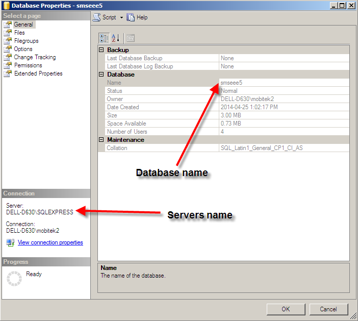 - The database is set up, in case you want to know about the detail of you database for further use in MOBITEK® SMS Engine (Enterprise Edition), right click on your database → properties
