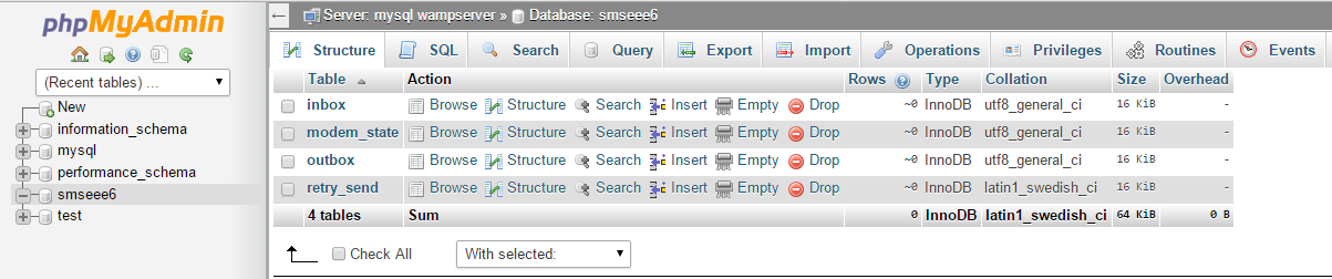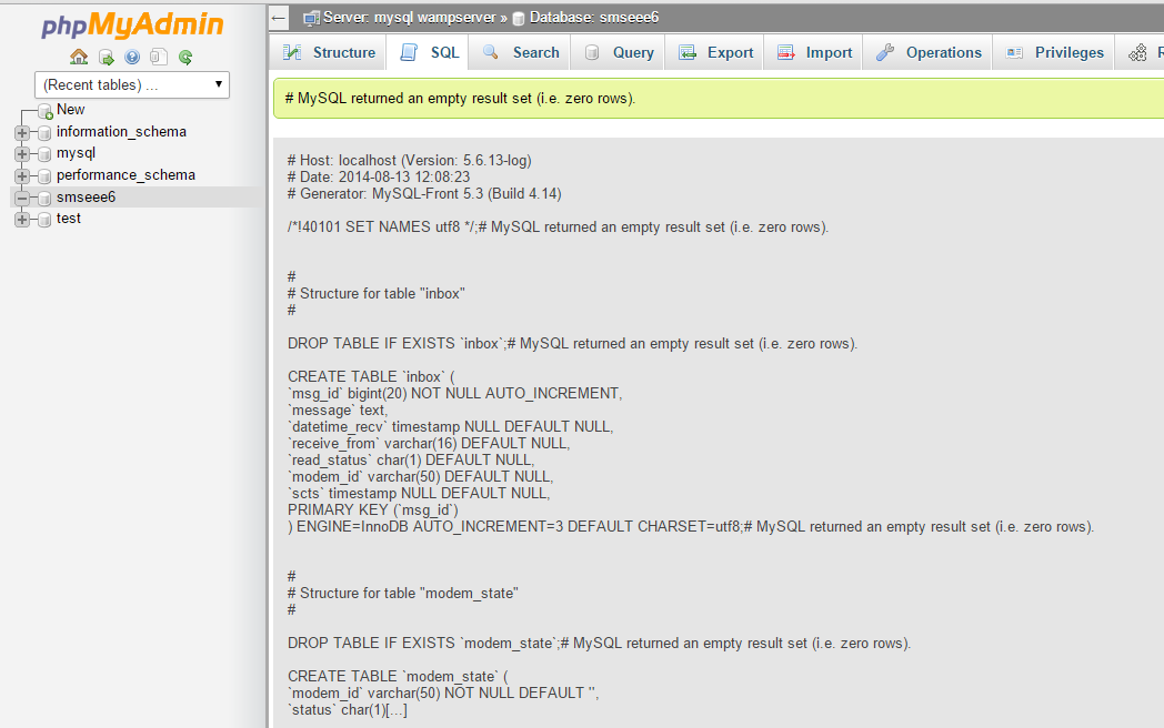 - Choose the correct SQL script to be executed, and 3 tables (inbox, outbox, modem_state) are created or added to your preferred database name